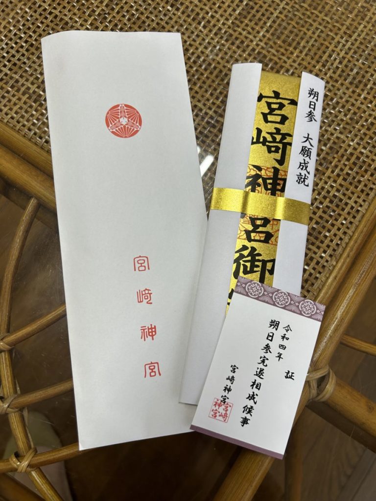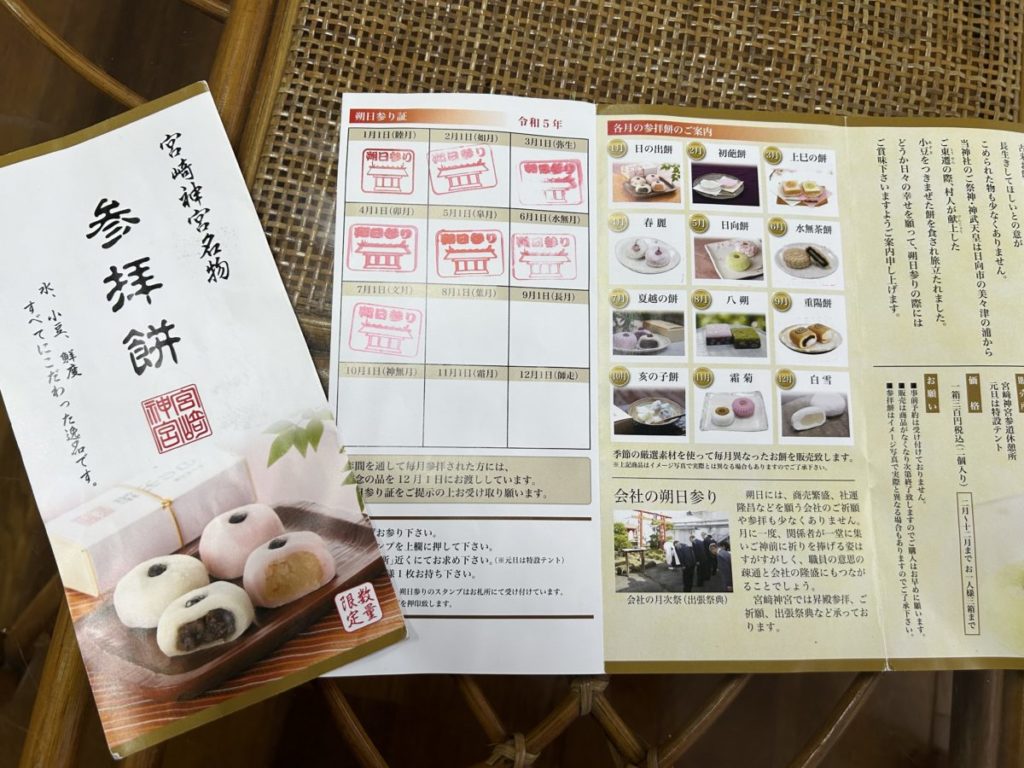 私が通う宮崎神宮では、名物 参拝餅が月代りで販売されます。早朝6時から参道休憩所で販売されるのでそれを楽しみに参拝される方も多いです。昨年は、テレビのニュース番組で紹介されて6時前から鳥居入口をはみ出して列が並んで買えない時もありました。今年は少し落ち着いてきました。参拝記念にスタンプをもらい年間を通して参拝すると12月に記念のお札を頂けます。去年はじめてコンプリート出来ました。今年も続いてます。